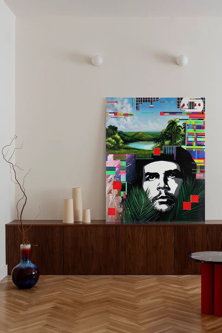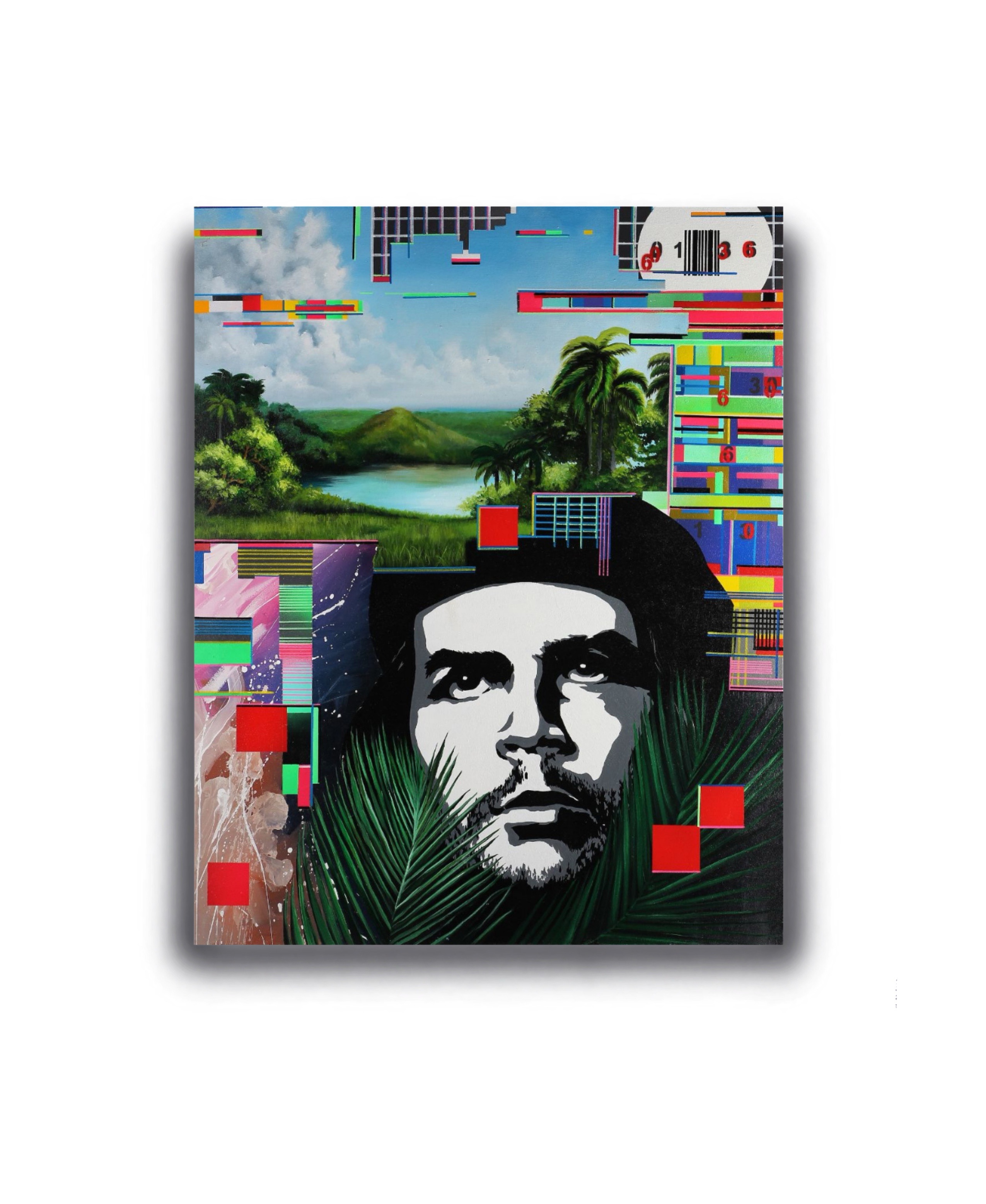 В верхней части полотна — райский пейзаж: Карибский лес, спокойная вода, обещание гармонии. Но он уже заражён: яркие пиксели, полосы, блоки данных внедряются в природу, будто пытаясь переписать её код. Ниже — иконический силуэт Гевары, выныривающий из зелёных пальмовых листьев, взгляд которого прорезает слои — исторические, идеологические, и, главное, информационные.
