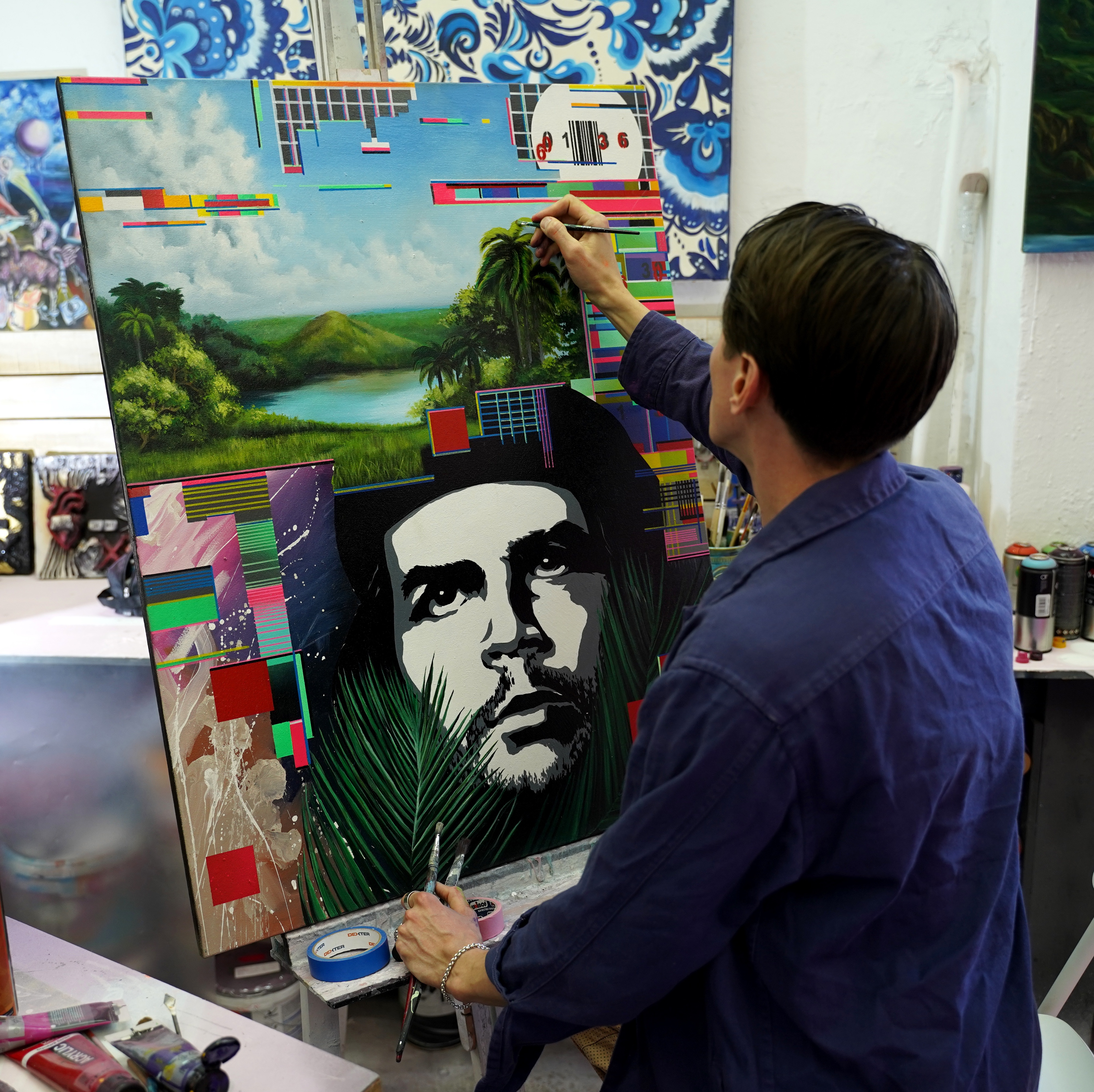 Lebedef интерпретирует образ команданте не как символ революционного героизма, а как артефакт, попавший в цифровой оборот. В его глитч-сюрреализме Че уже не принадлежит себе — его лик стал тем, что копируют, штампуют, обрабатывают и продают. Революция превращена в бренд; личность — в иконографический код; смысл — в данные, которые могут дать сбой.