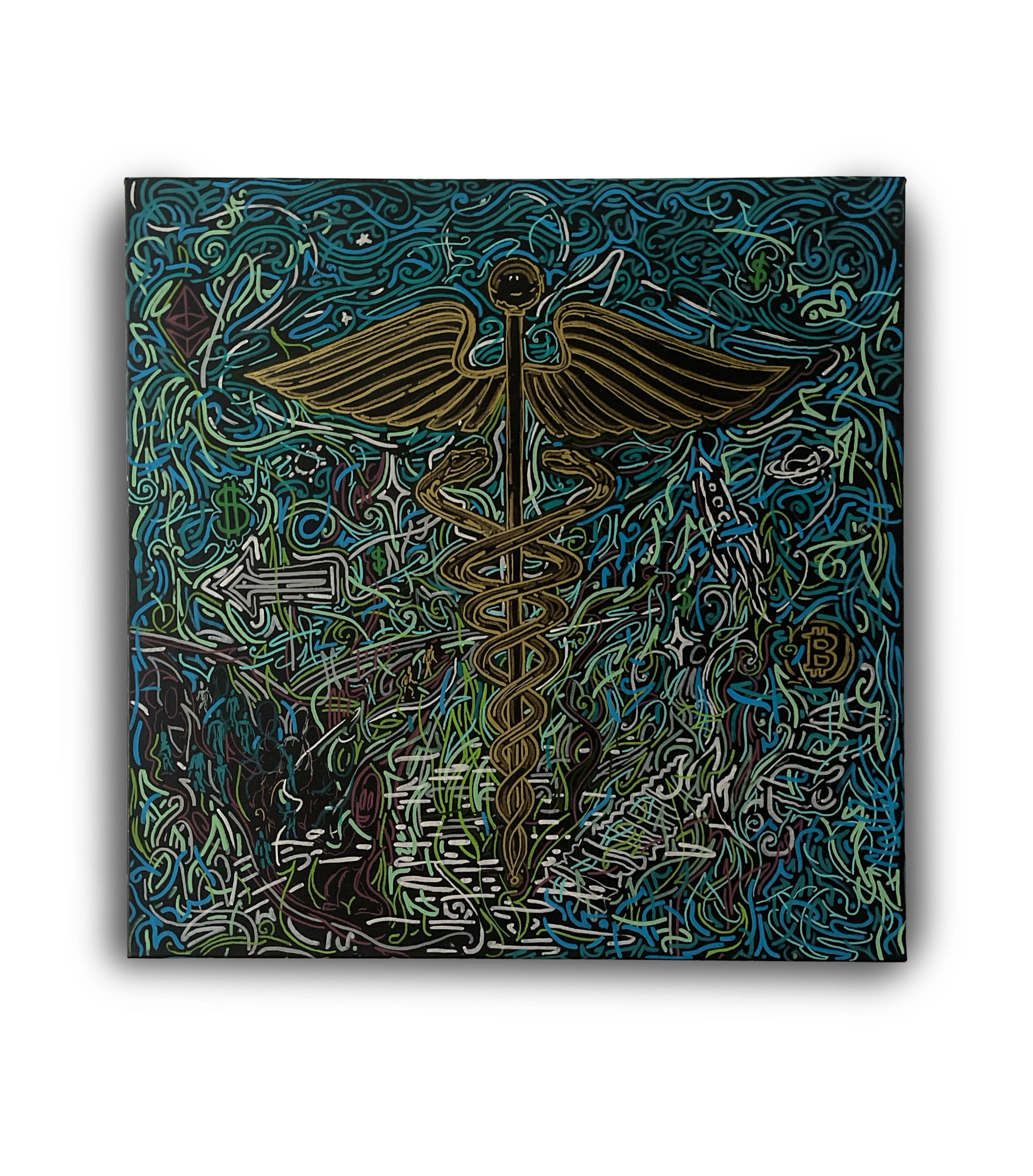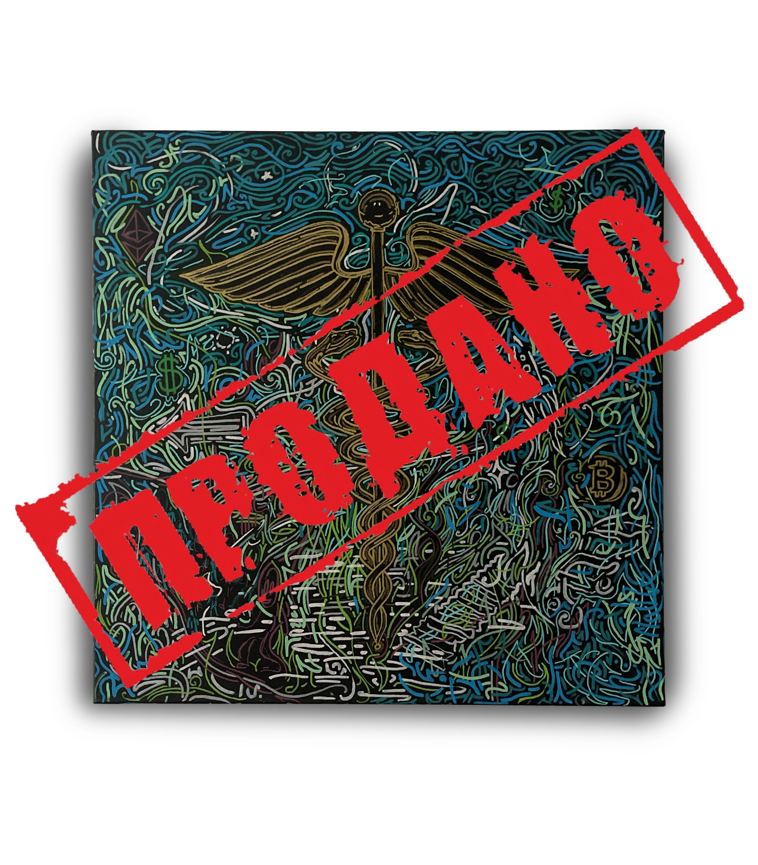 В центре - кадуцей: жезл с шаром, обвитый двумя змеями и увенчанный крыльями.