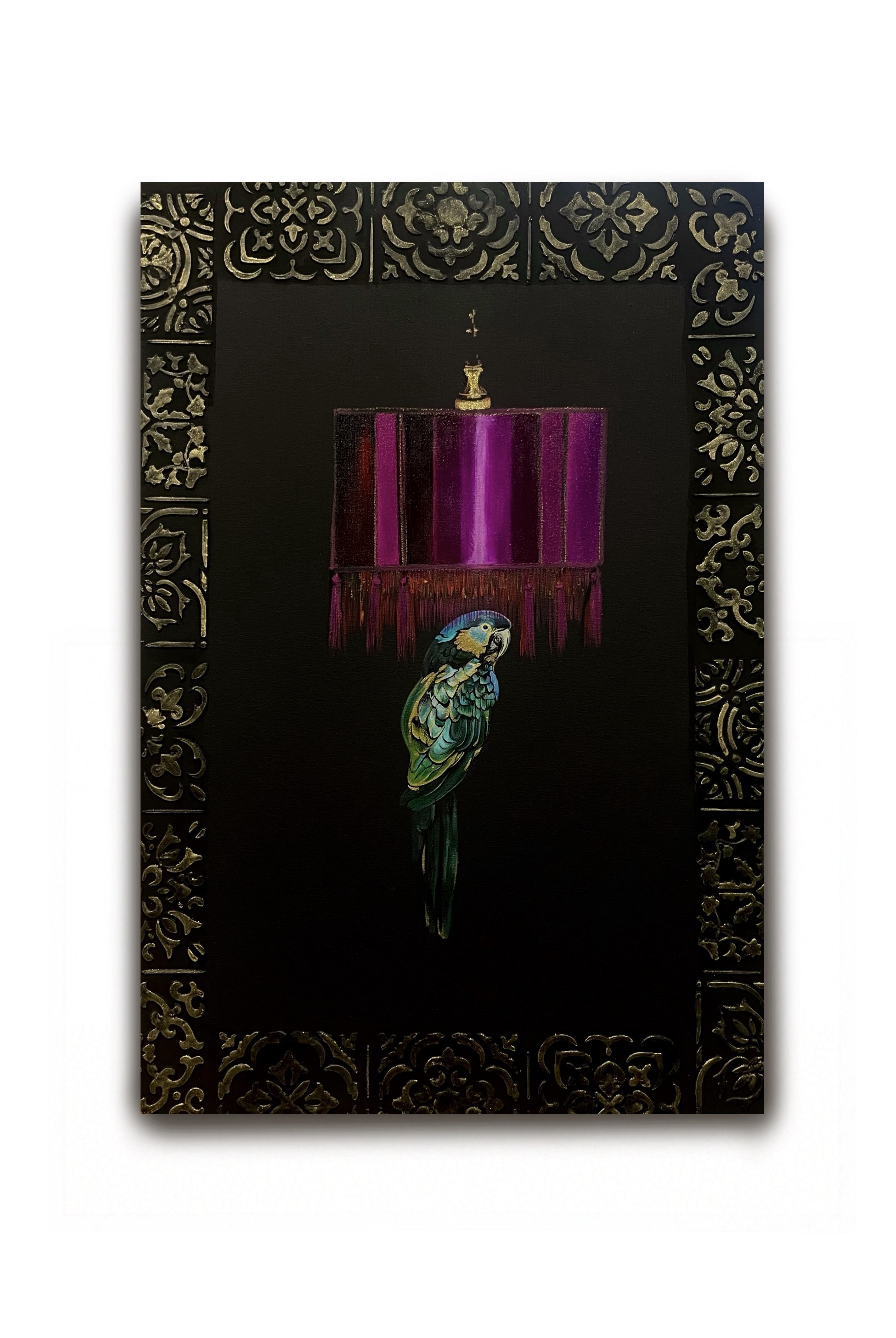 Это история о грани между светом и тенью, о мгновении ожидания. Попугай застыл под абажуром, словно колеблясь между шагом вперёд и спокойствием привычного. В этом образе — нерешительность, утончённость и глубина.