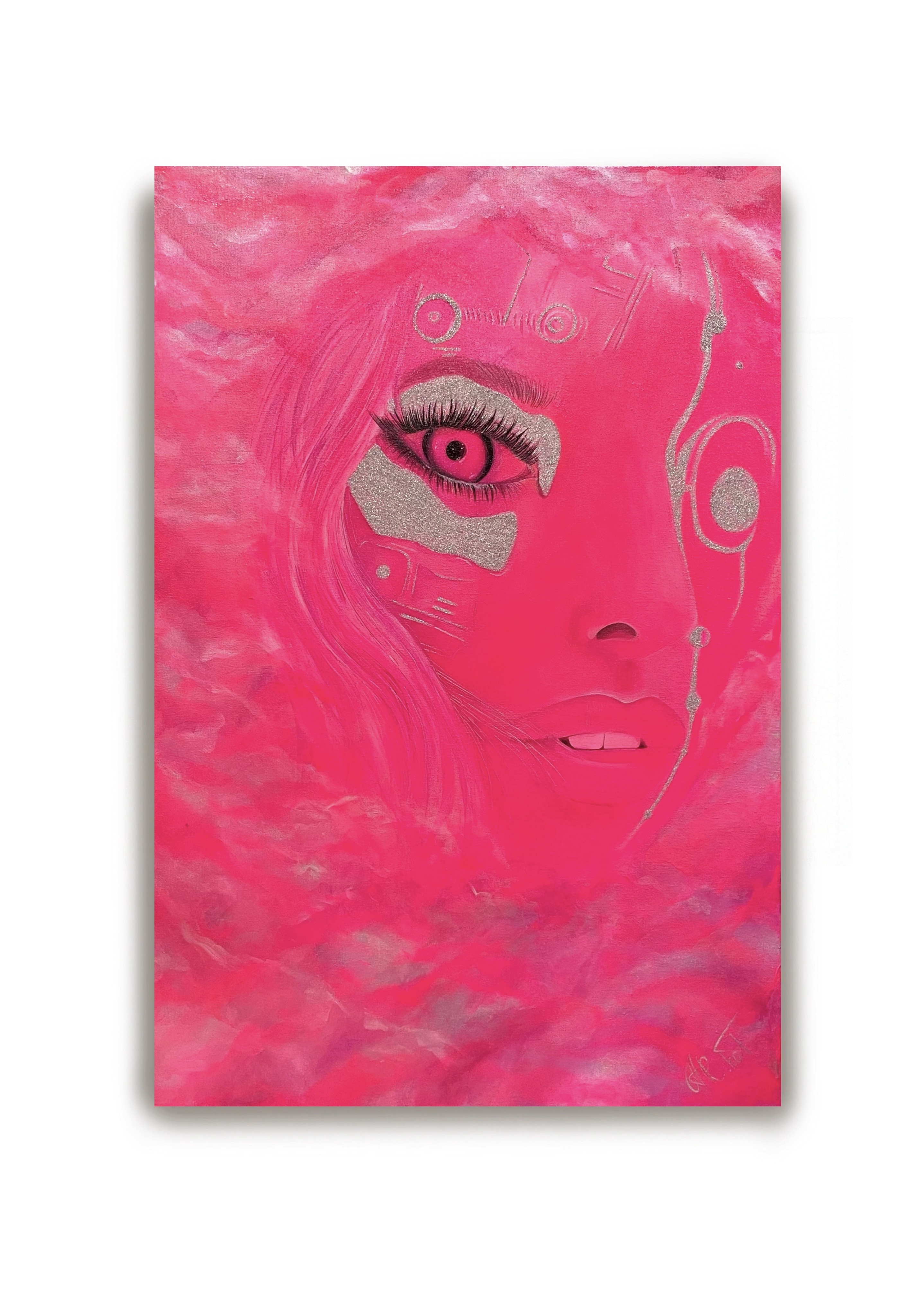 «Девушка из облачного киберпанка»— это воплощение будущего, в котором цифровые технологии становятся частью личности. Яркий розовый фон напоминает лёгкость и подвижность облаков, из которых рождается её образ. Её взгляд, усиленный металлическими элементами, выражает силу и загадочность, а контрасты в цветах символизируют гармонию между нежностью и мощью высоких технологий. Картина вдохновляет на размышления о симбиозе реального и виртуального миров.