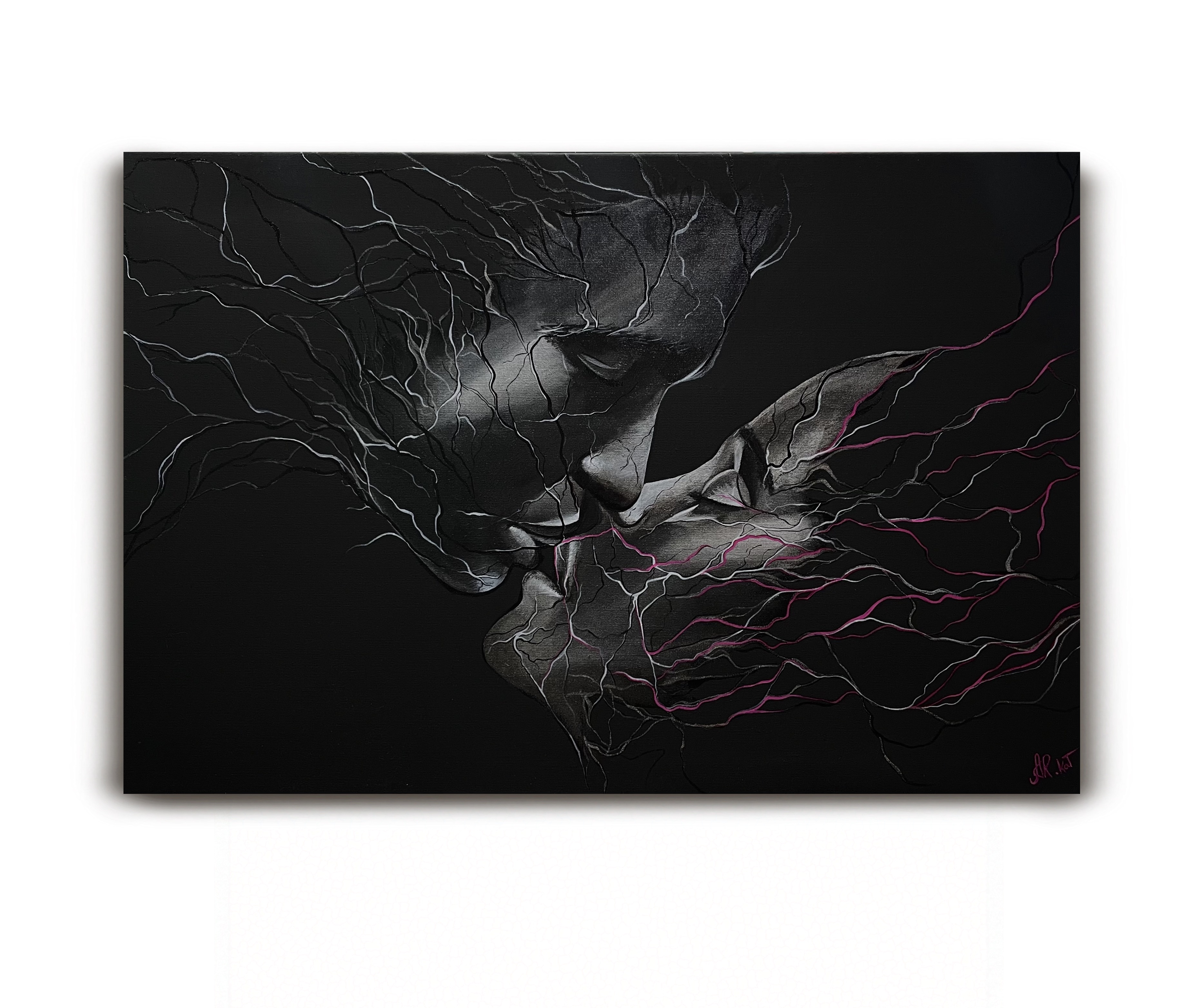 Эта картина воплощает момент зарождения любви, когда все начинается с тонкого импульса влечения. Линии — как невидимые нити энергии, соединяющие души, — символизируют искру, которая постепенно превращается в мощный поток чувств. Это история о том, как одно прикосновение, одно мгновение может разжечь пламя, создавая глубокую связь, которая выходит за пределы слов и времени.