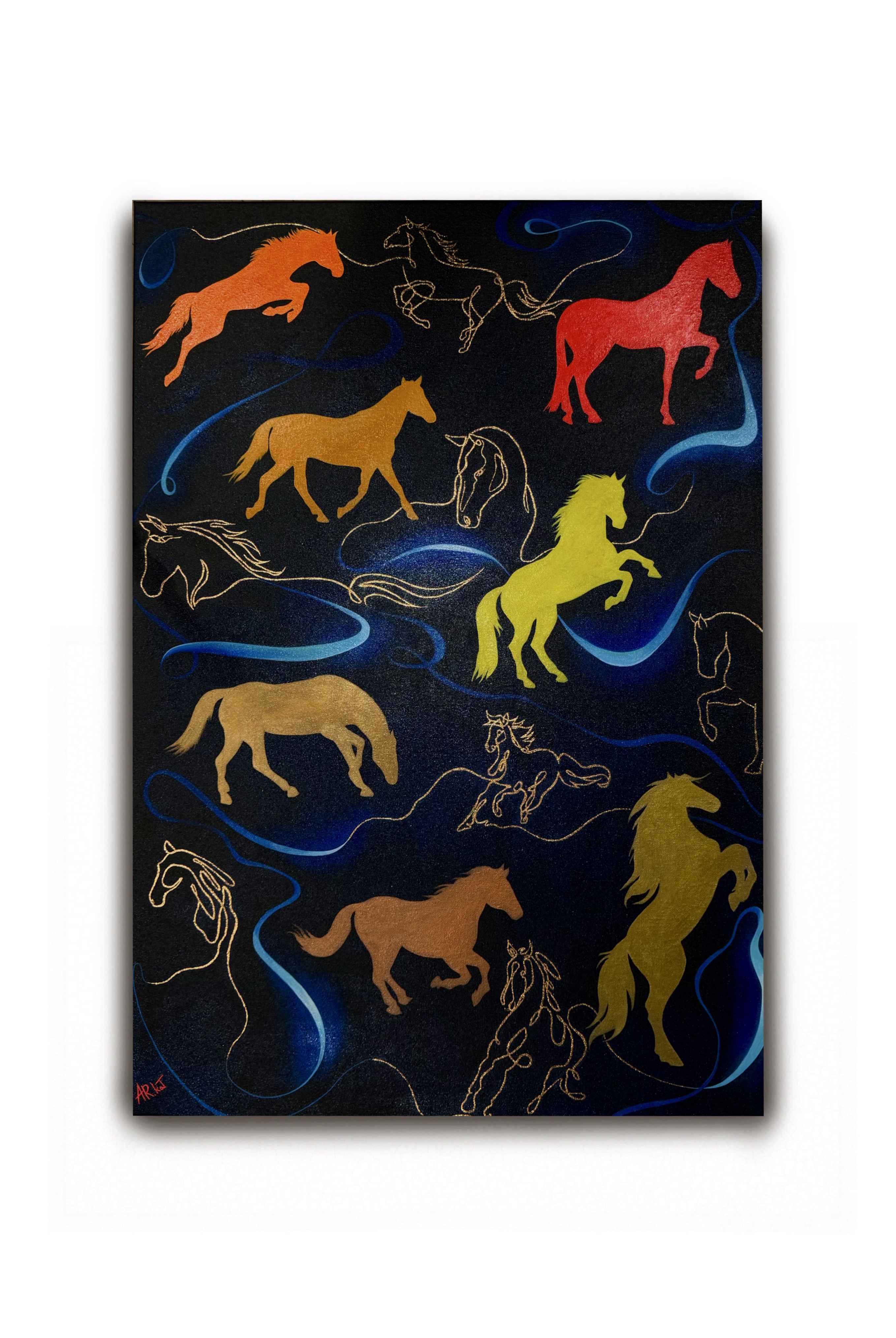 Эта работа — про внутреннюю силу и стремление вперёд. Лошади символизируют свободу выбора, энергию действия и уверенность в собственном пути. Каждый цвет - это характер, каждое движение - решение. Синий неон объединяет образы в единую траекторию роста и развития.