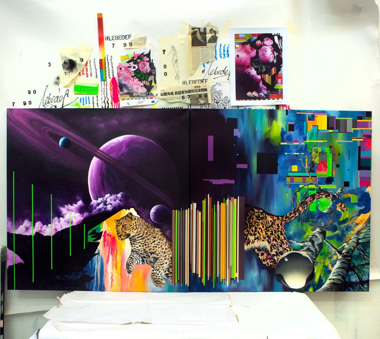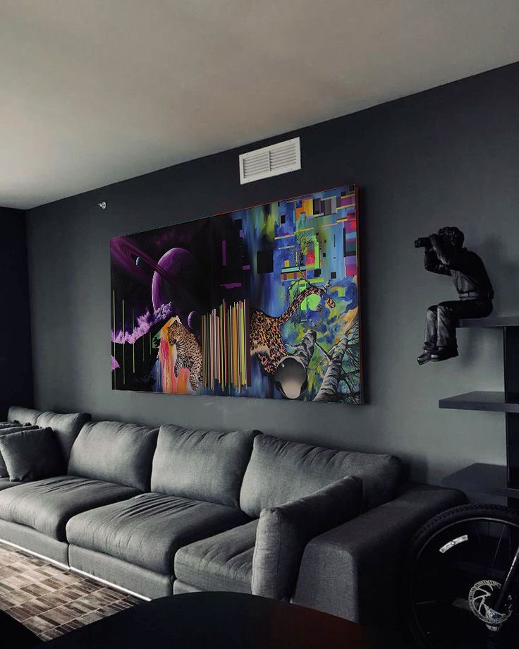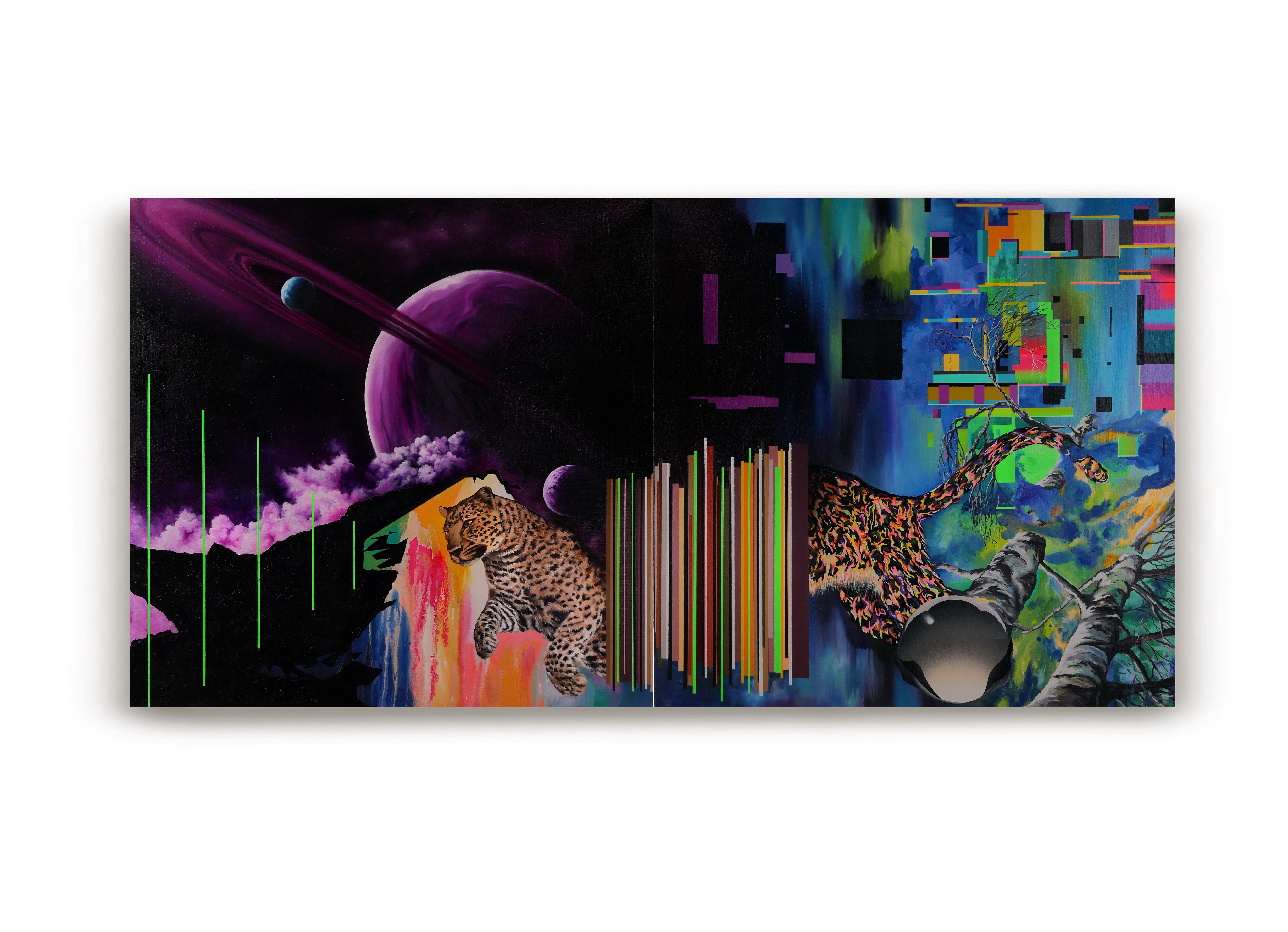 Правая часть композиции наполнена образами космического и нейронного пространства: северное сияние, чёрные дыры, шарообразный объект, из которого возникает ещё не сформированная часть барса. Это визуальная метафора рождения нового состояния сознания — момента, когда нейронные связи перестраиваются, а восприятие выходит за пределы линейного времени.