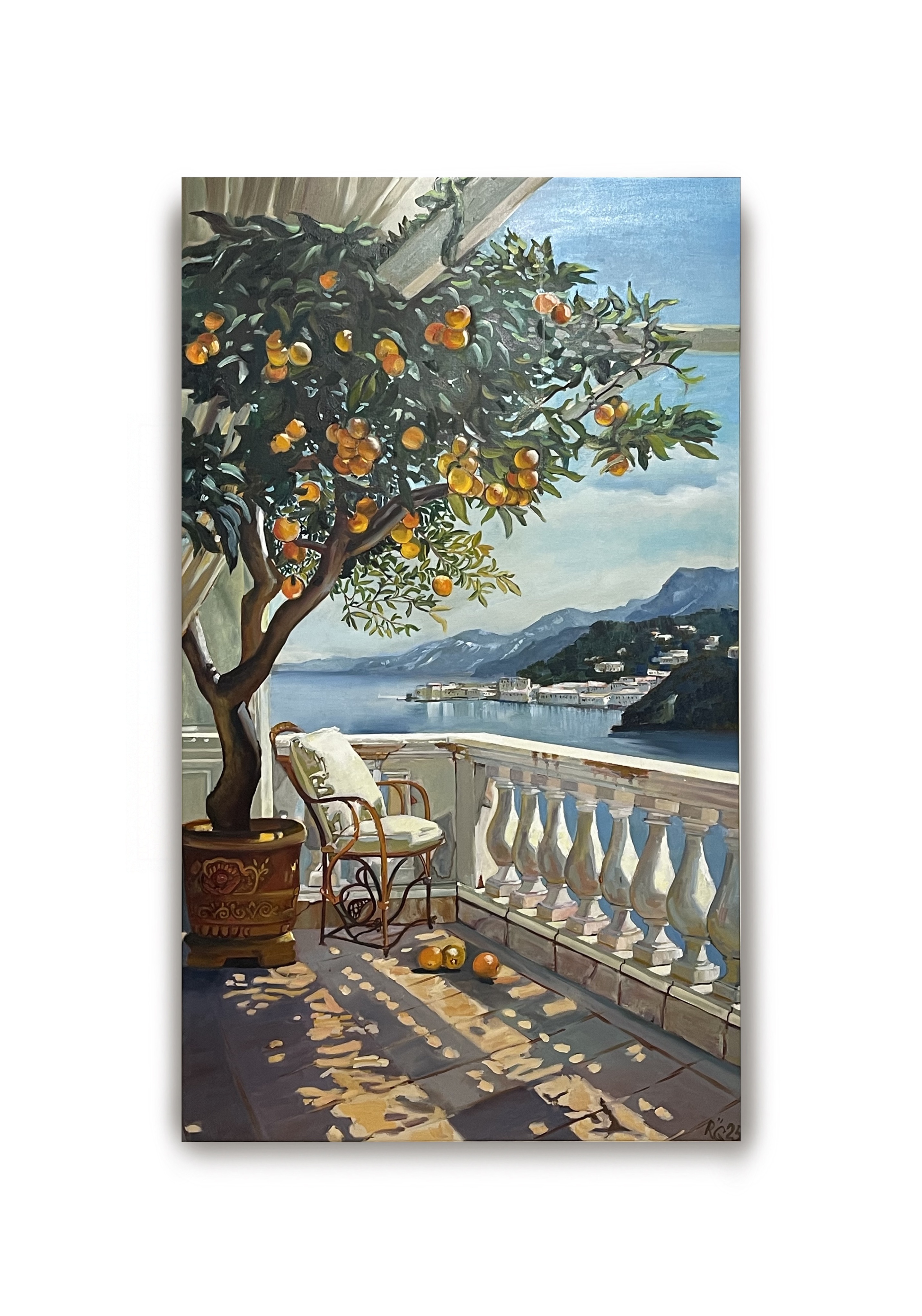 Писала картину, когда очень хотела поехать отдохнуть и настроение было чемоданным. Писалось легко, позитивно. Ощущалась и прохлада недавнего утра, и запах и вкус мандаринов, и красота окрестности. Как будто кусочек райского места остался навсегда во мне.