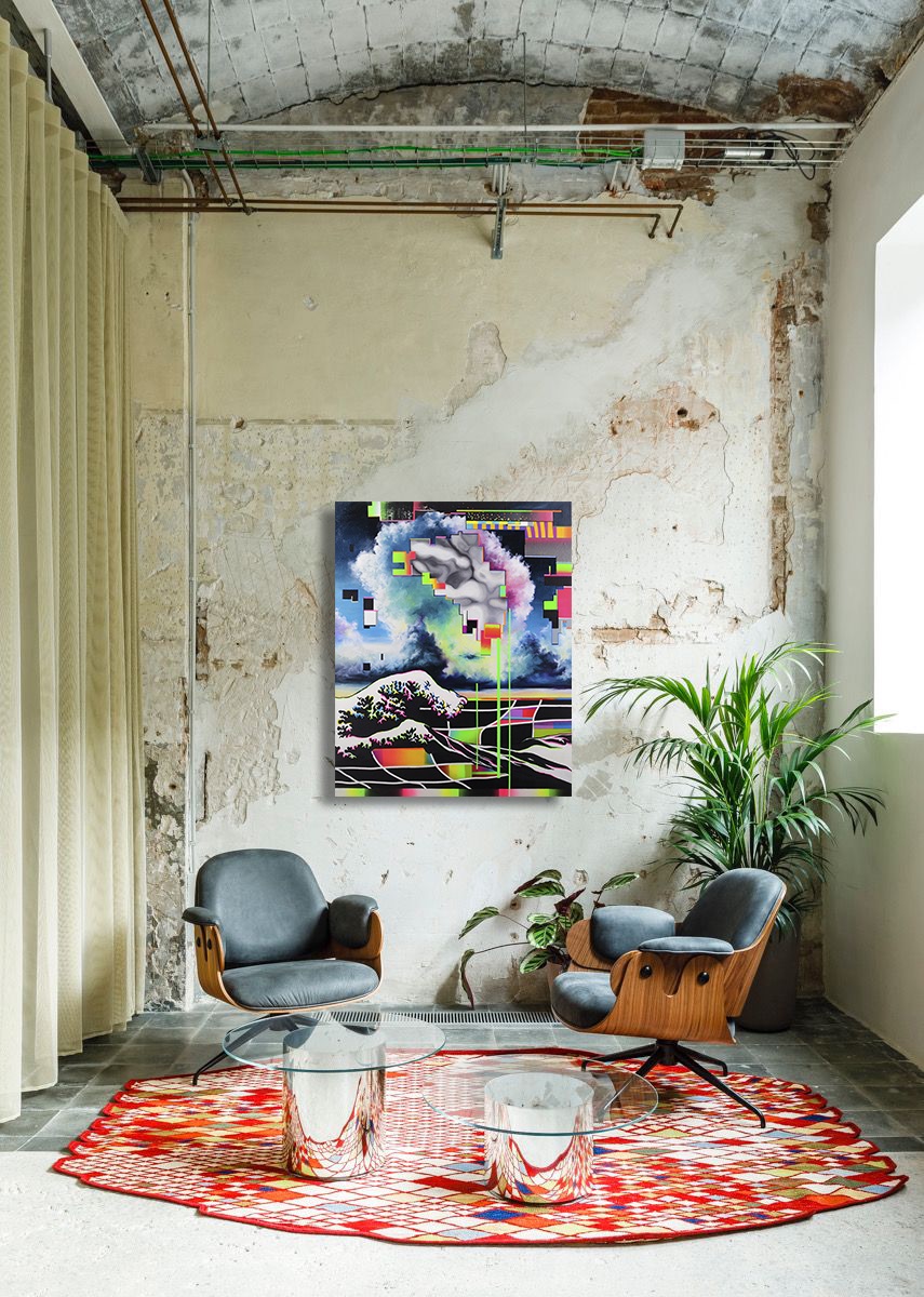 Работа словно склеивает несколько временных слоев: классический мотив волны — в духе Хокусая — перепадает через призму современного восприятия, которая уже не отделима от экранов, сеток, пикселей и программного шума.