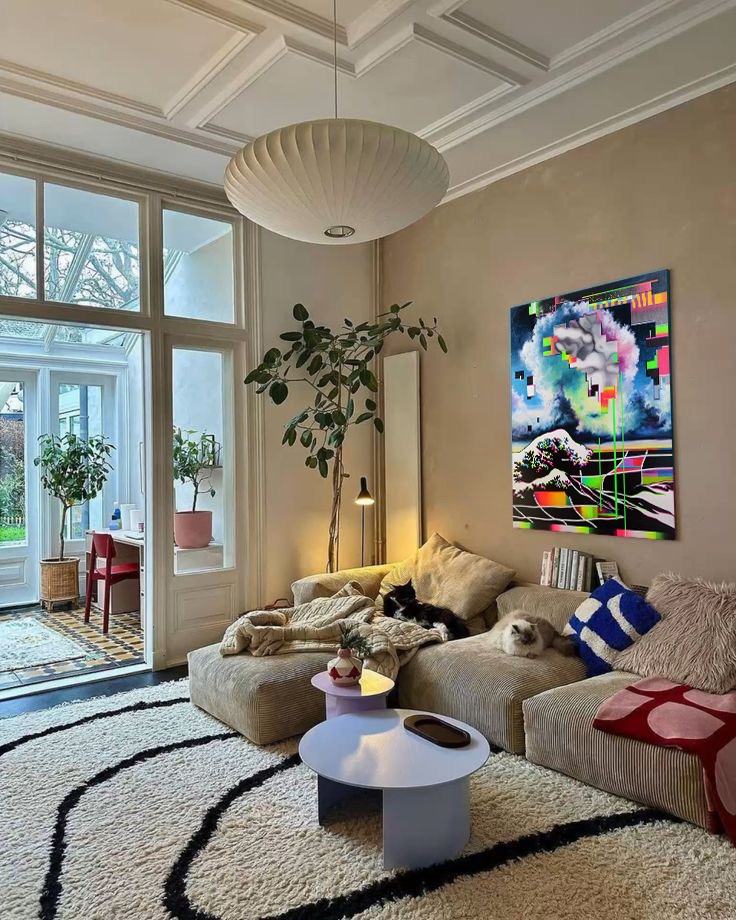 Lebedef встраивает узнаваемый символ в постцифровый контекст: пикселизация ломает изображение, яркие неоновые поля и флуоресцентные линии будто симулируют ошибки загрузки, а облачные структуры на фоне превращаются в синтетическое небо — собранное из фрагментов памяти.