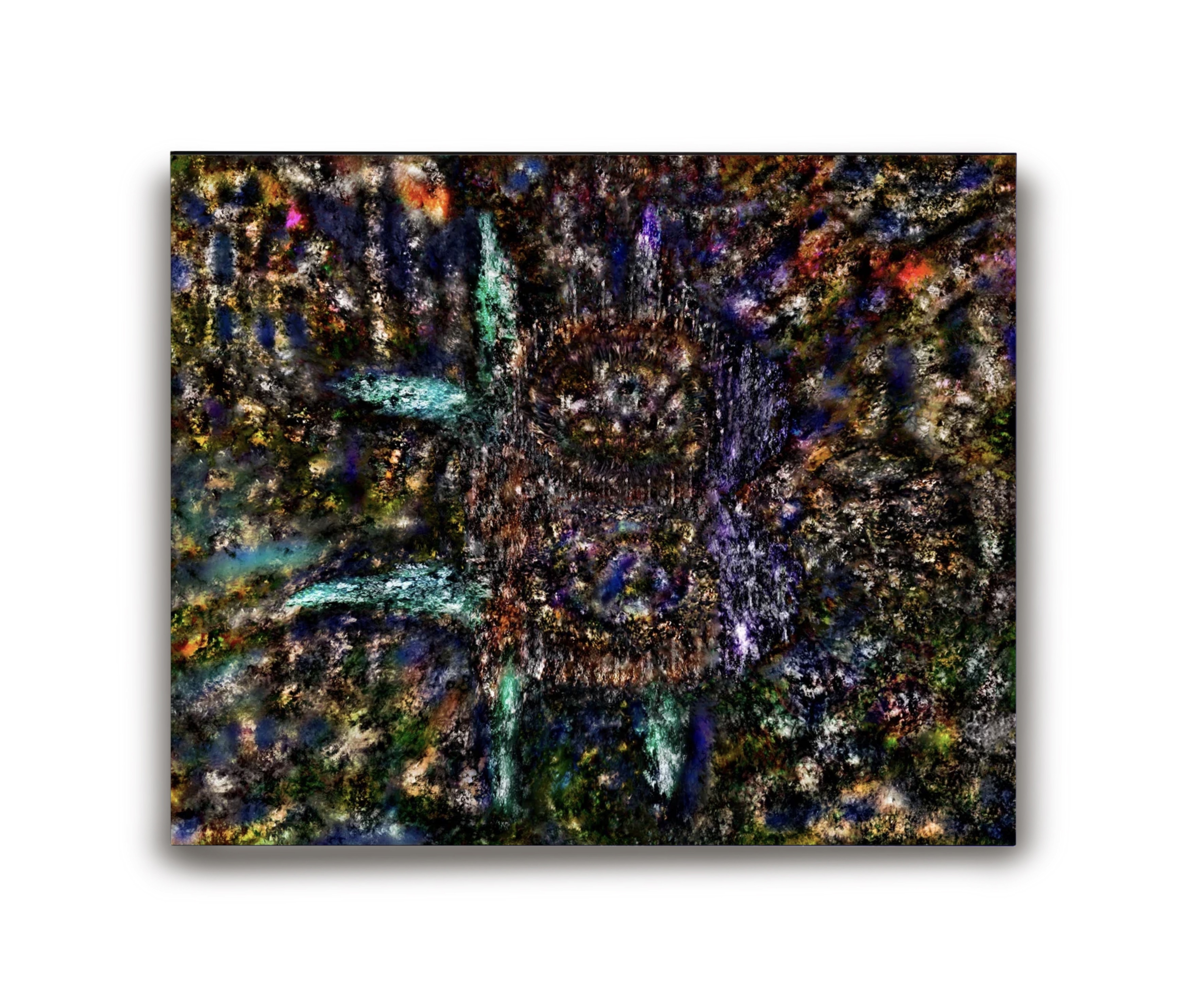 Многоуровневая структура полотна погружает в иллюзию бездонной глубины — будто взгляд проваливается в лабиринт времён, где грани прошлого, астоящего и будущего размыты и переплелись воедино 3 сердце композиции проступает загадочный образ — нечто среднее межд лицом и мистической маской. Он соткан из беспорядочных мазков и цветовых фрагментов, словно выныривает из тумана грёз, будя в душе одновременно любопытство и лёгкий холодок тревоги. Бирюзовые «лучи», исходящие из центра, похожи на потоки неведомой энергии или древние знаки, вплетённые в художественную ткань. Они резко контрастируют с мрачной, почти колдовской палитрой фона, создавая эффект напряжённого противостояния.