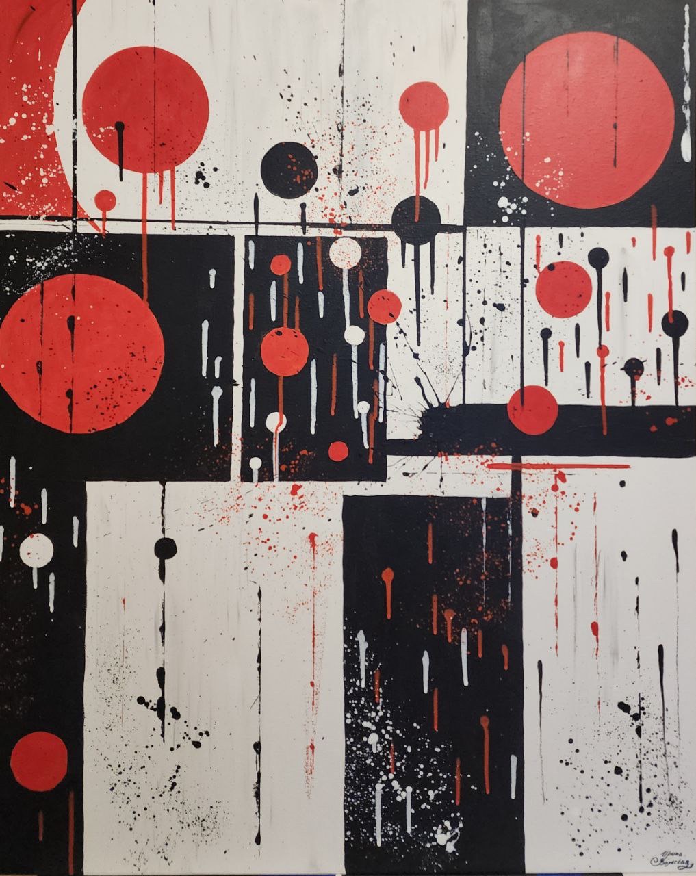 Композиция выстроена как фрагментированный визуальный код. Черно-белая структура нарушается красными кругами – сигнальными точками, похожими на маркеры сбоя или потерянного соединения. Потеки и разрывы поверхности усиливают ощущение помехи и нестабильности.