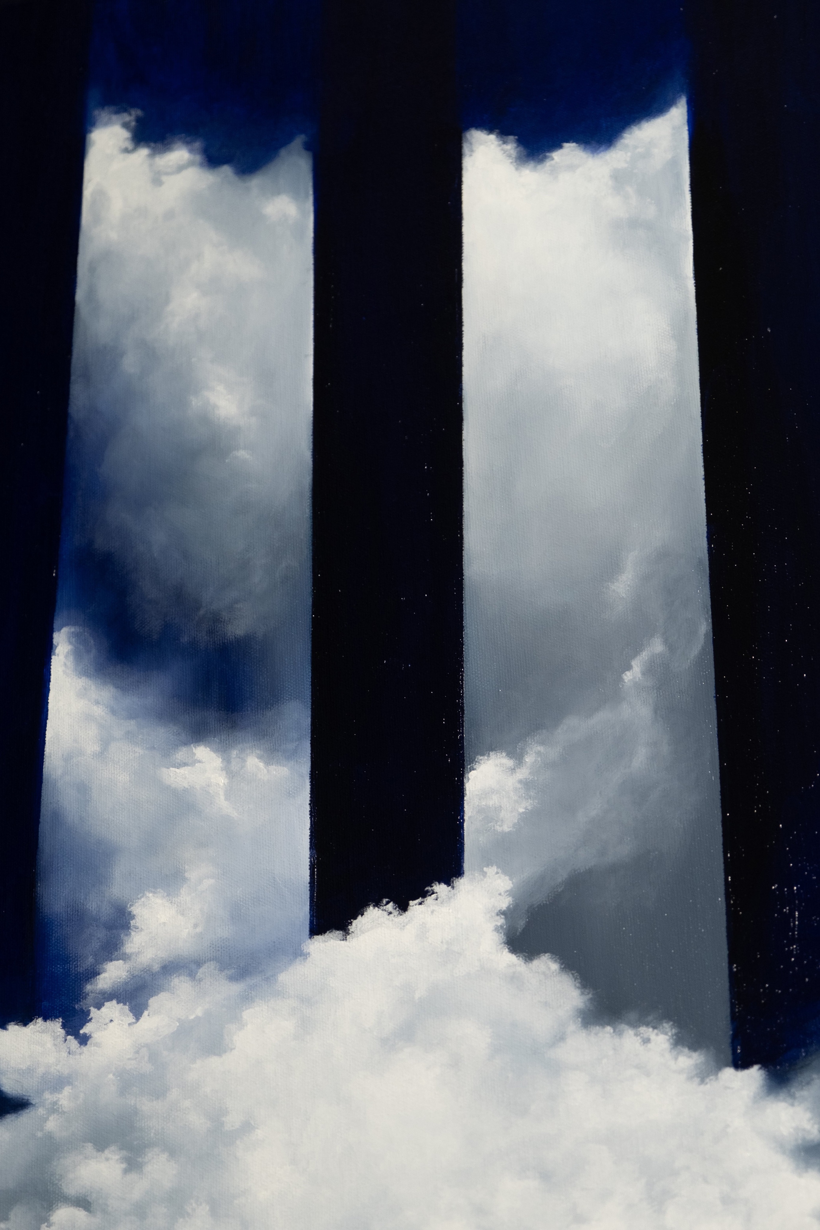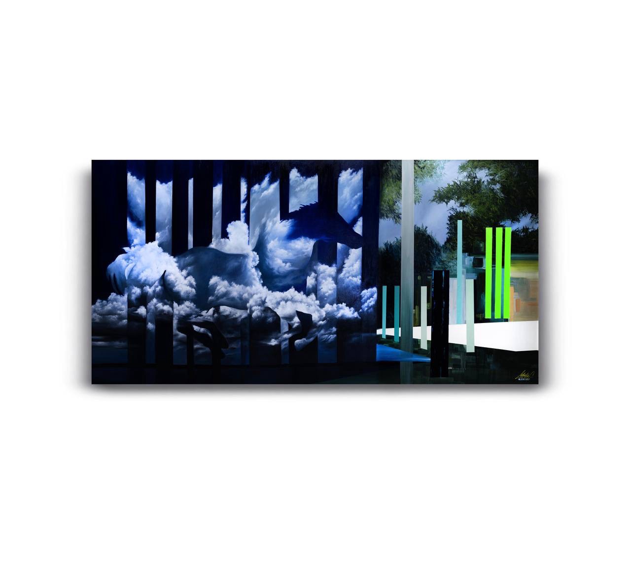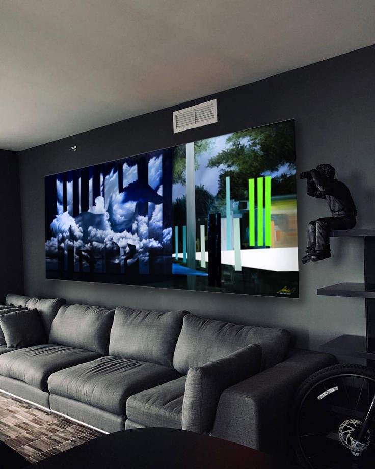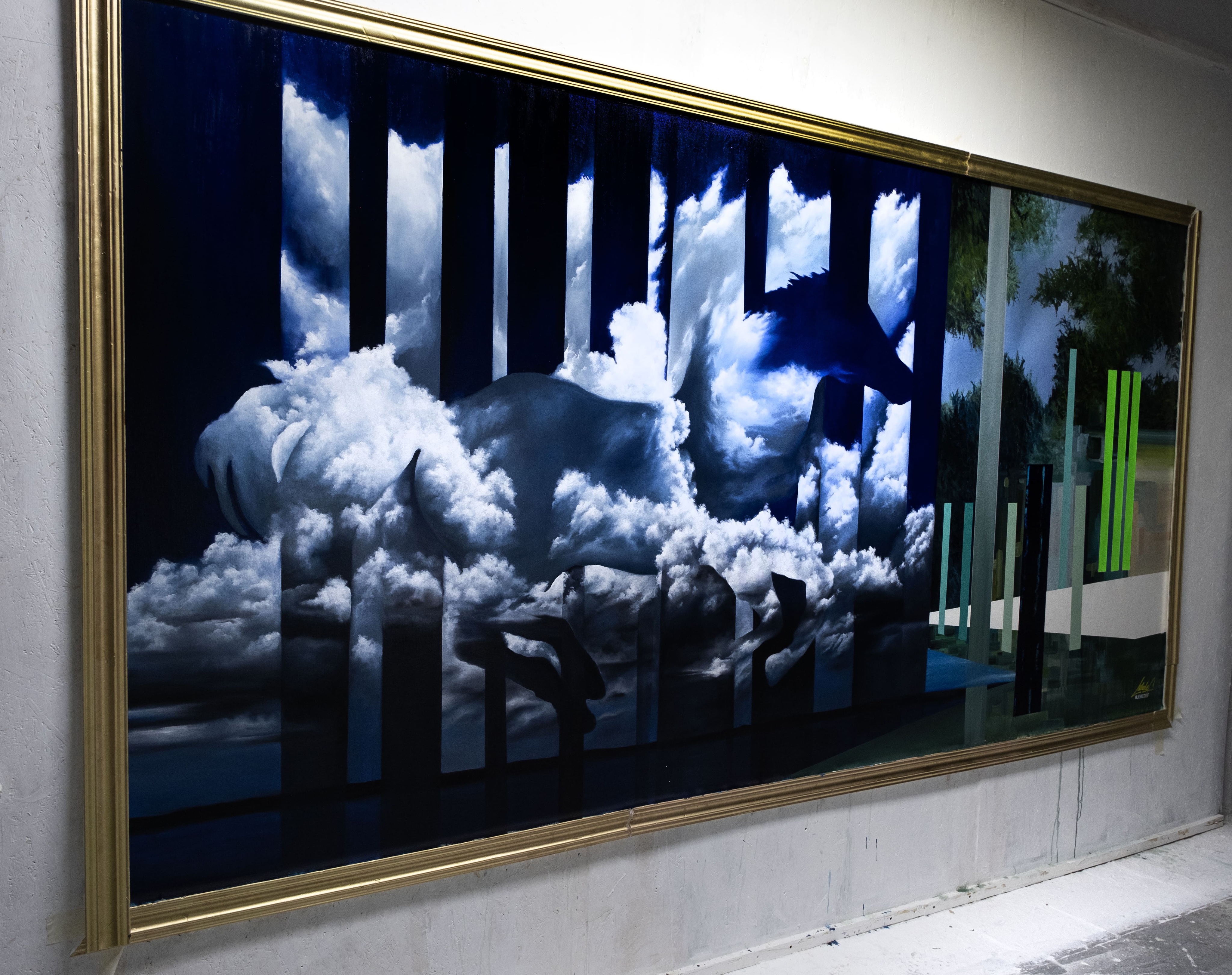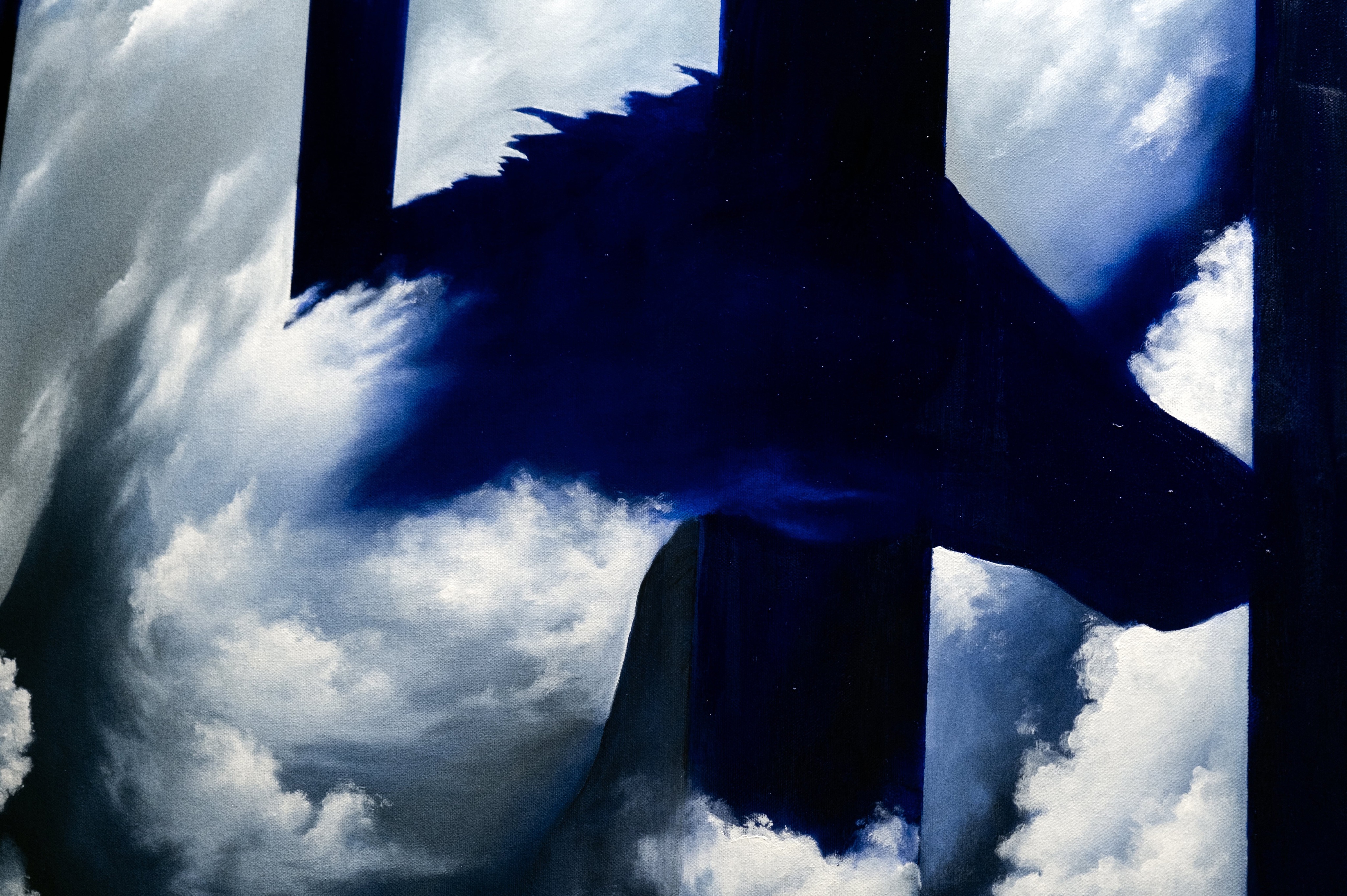 Картина создана в его индивидуальной авторской манере глитч-сюрреализм — художественного языка, соединяющего ошибки, разрывы и искажения с поэтикой сверхреального мира. Силуэт, вырастающий из облаков, — не только символ свободы, но и образ человека, который вырывается из структурированной реальности: вертикальные полосы словно данные, кодовые строки, ограничивающие движение.