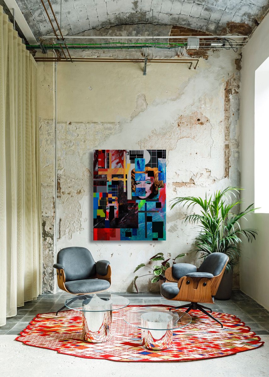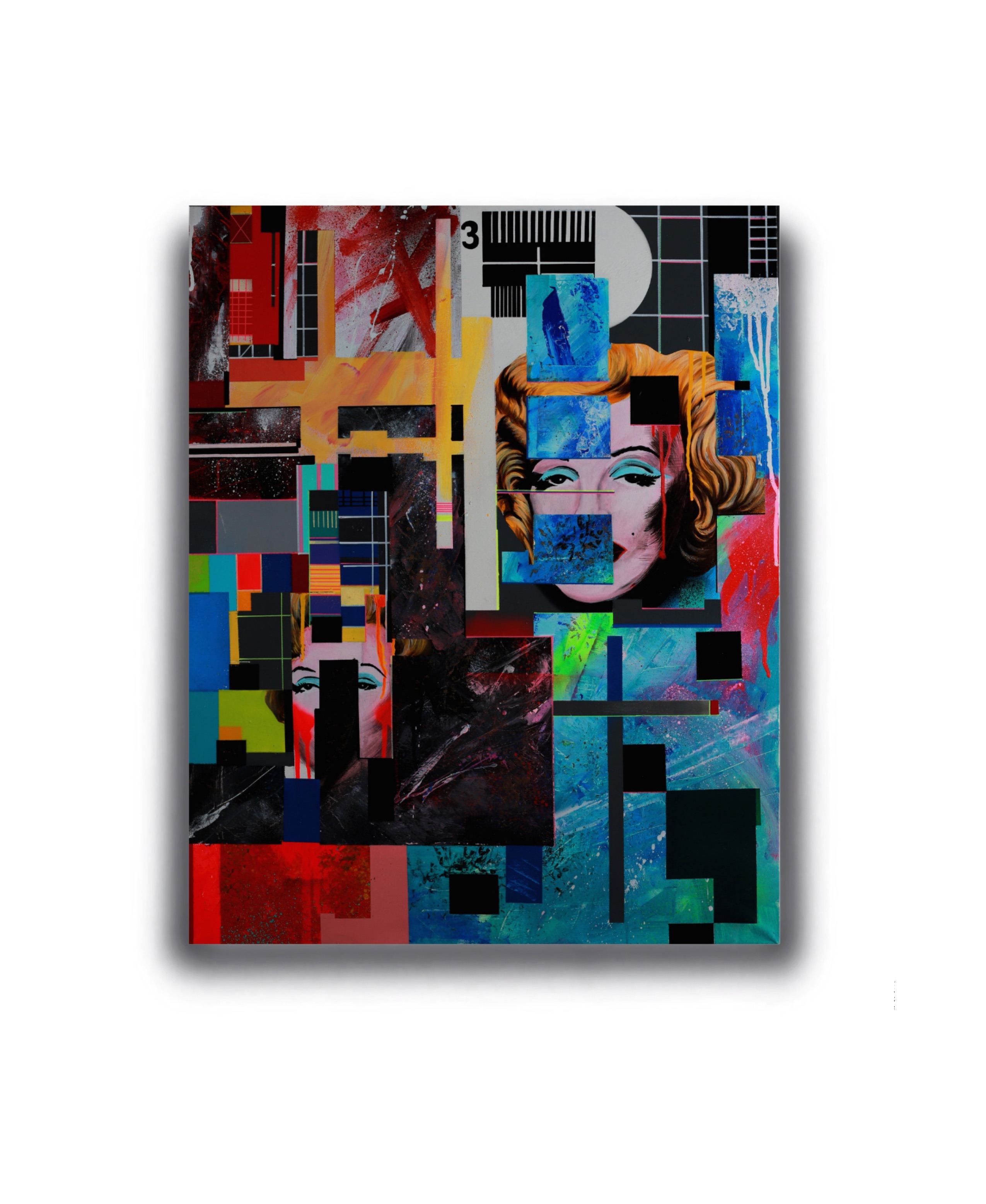 В центре картины — культовый образ Мэрилин Монро, узнаваемый и разорванный на отдельные фрагменты. Lebedef намеренно дробит лицо на пиксельные слои, квадратные сбои и цветовые шумы, превращая живую фигуру в поток разрозненных визуальных сигналов.