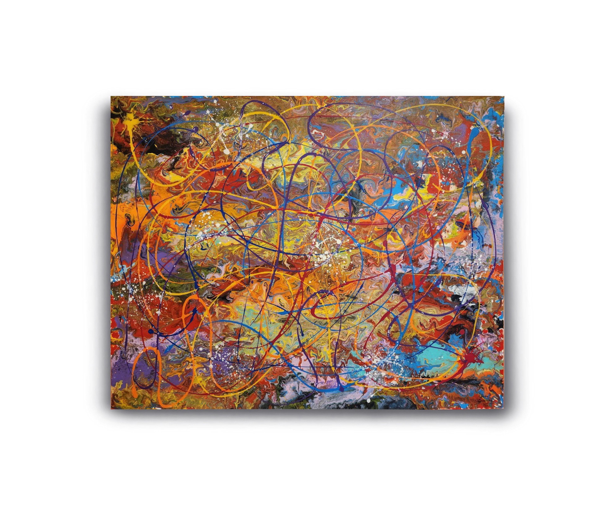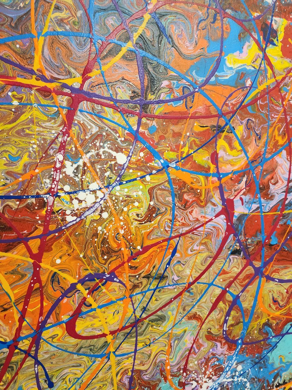 Работа строится как многослойное поле движения, в котором цвет и линии образуют ритмическую структуру. Переплетающиеся траектории создают ощущение непрерывного потока – визуального эквивалента внутреннего пульса, энергии жизни и изменения.