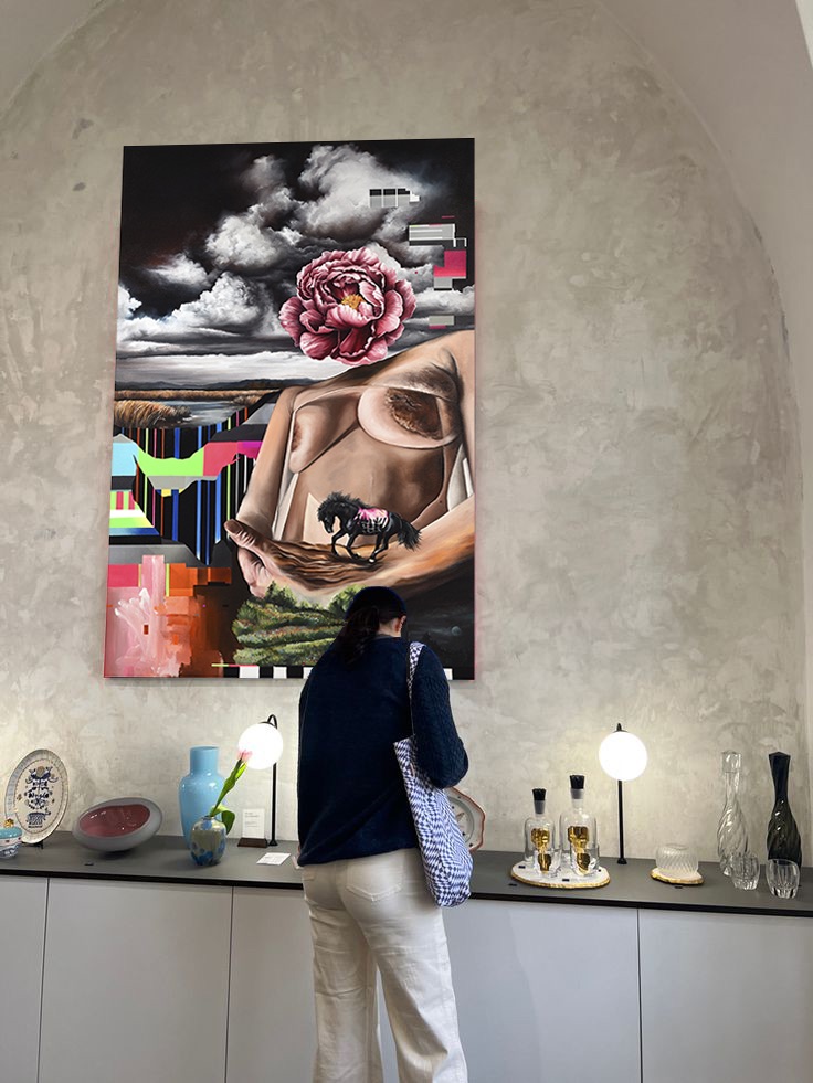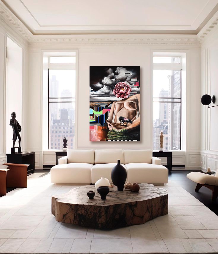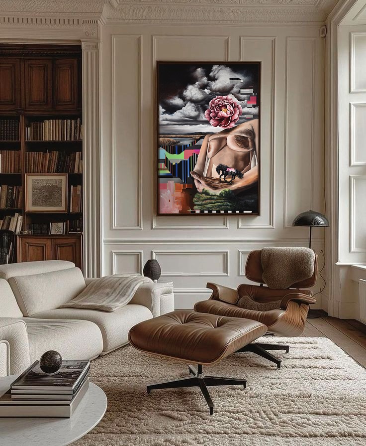 Почему это работает: контраст между мягкой, телесной чувственностью изображения и геометрией интерьера создаёт напряжение и глубину восприятия; картина задаёт сложный, взрослый и эмоционально насыщенный акцент в пространстве; идеально вписывается в журнальный материал о коллекционном искусстве нового времени, соединяя телесность, сюрреализм и цифровую эстетику. Это не просто декор. Это провокация, диалог и зеркало личных чувств, встроенное в интерьер