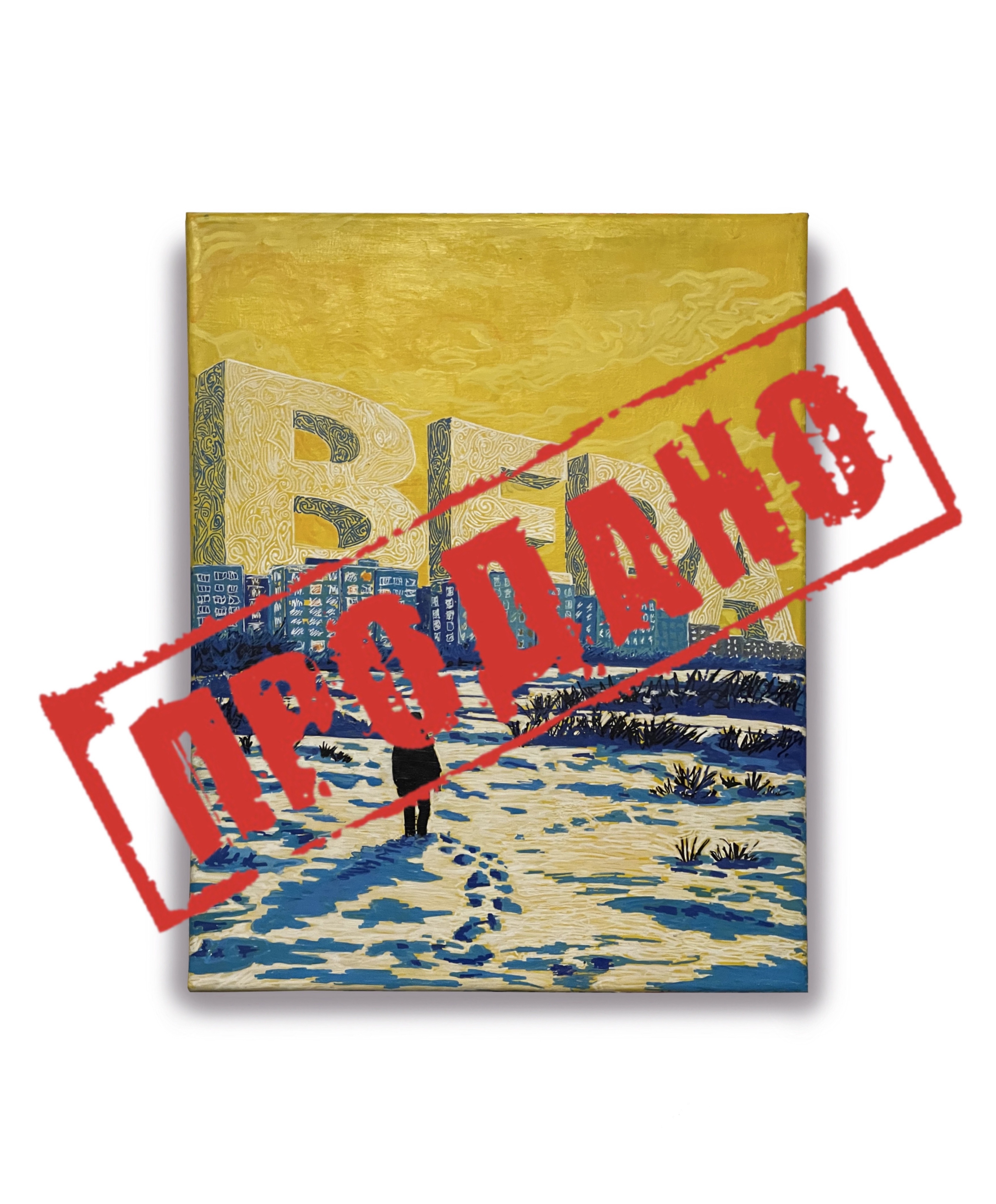 Фигура стоит один на один с полем и городом. В небе прорезается слово «Вера» - это внутреннее состояние, к которому он уже постепенно подходит.