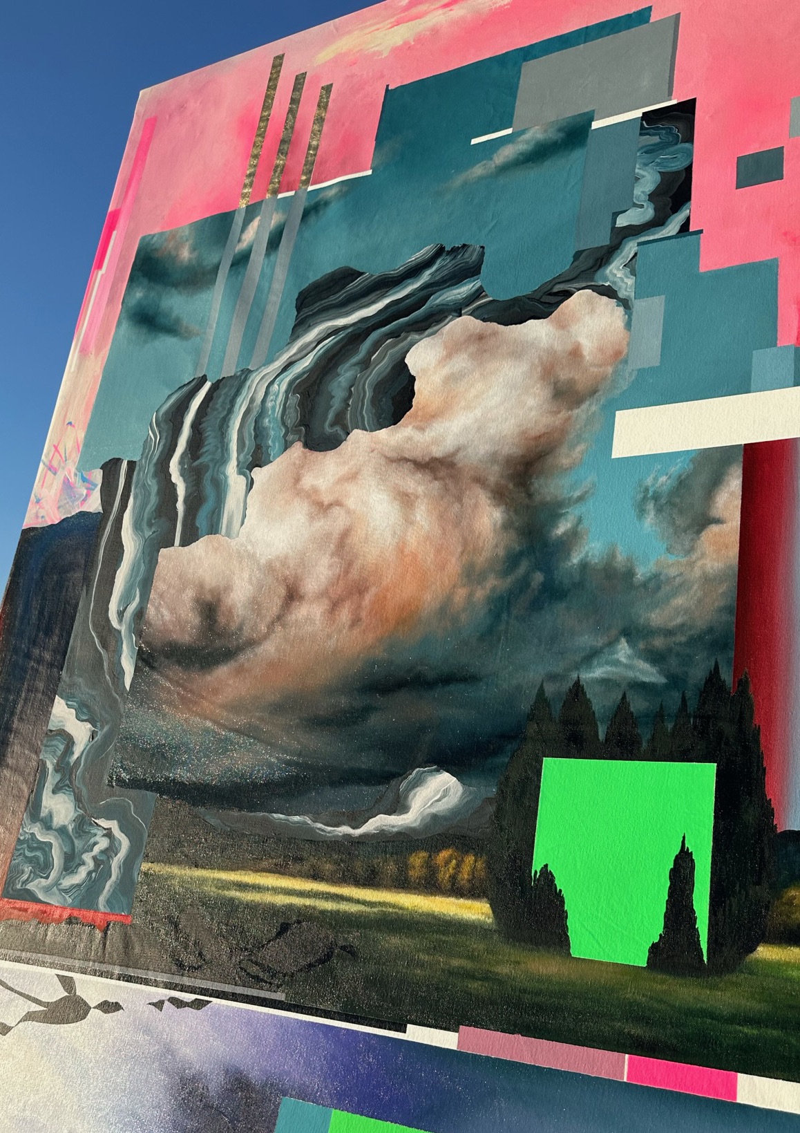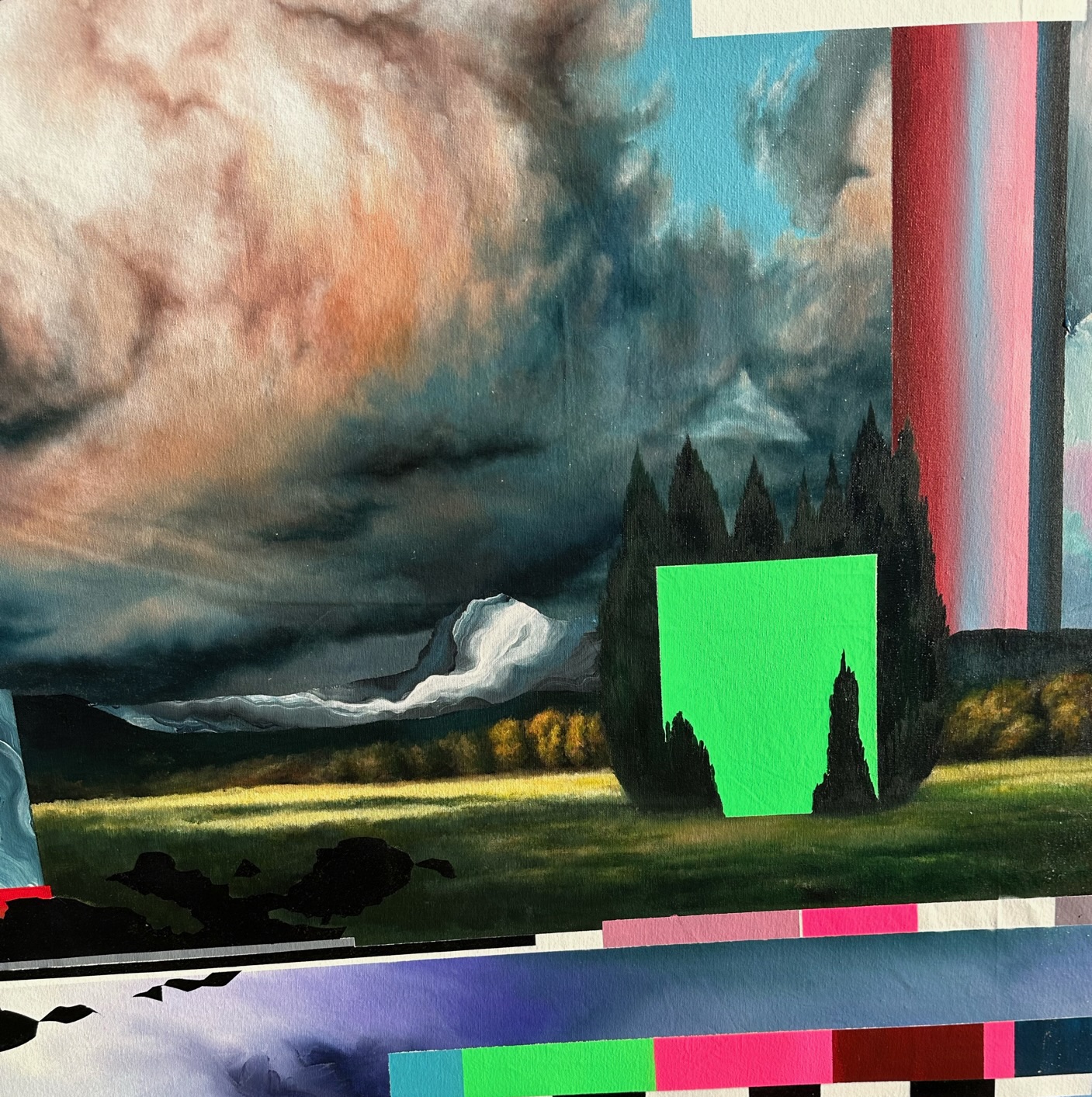 «Вне шума» — о парадоксе современного человека. Физически находясь на природе, он продолжает мыслить фрагментами: о прошлом, будущем, делах, сообщениях, потоках данных. Картина визуализирует этот внутренний шум — момент, когда мысли бегут быстрее ощущений, а настоящее ускользает.