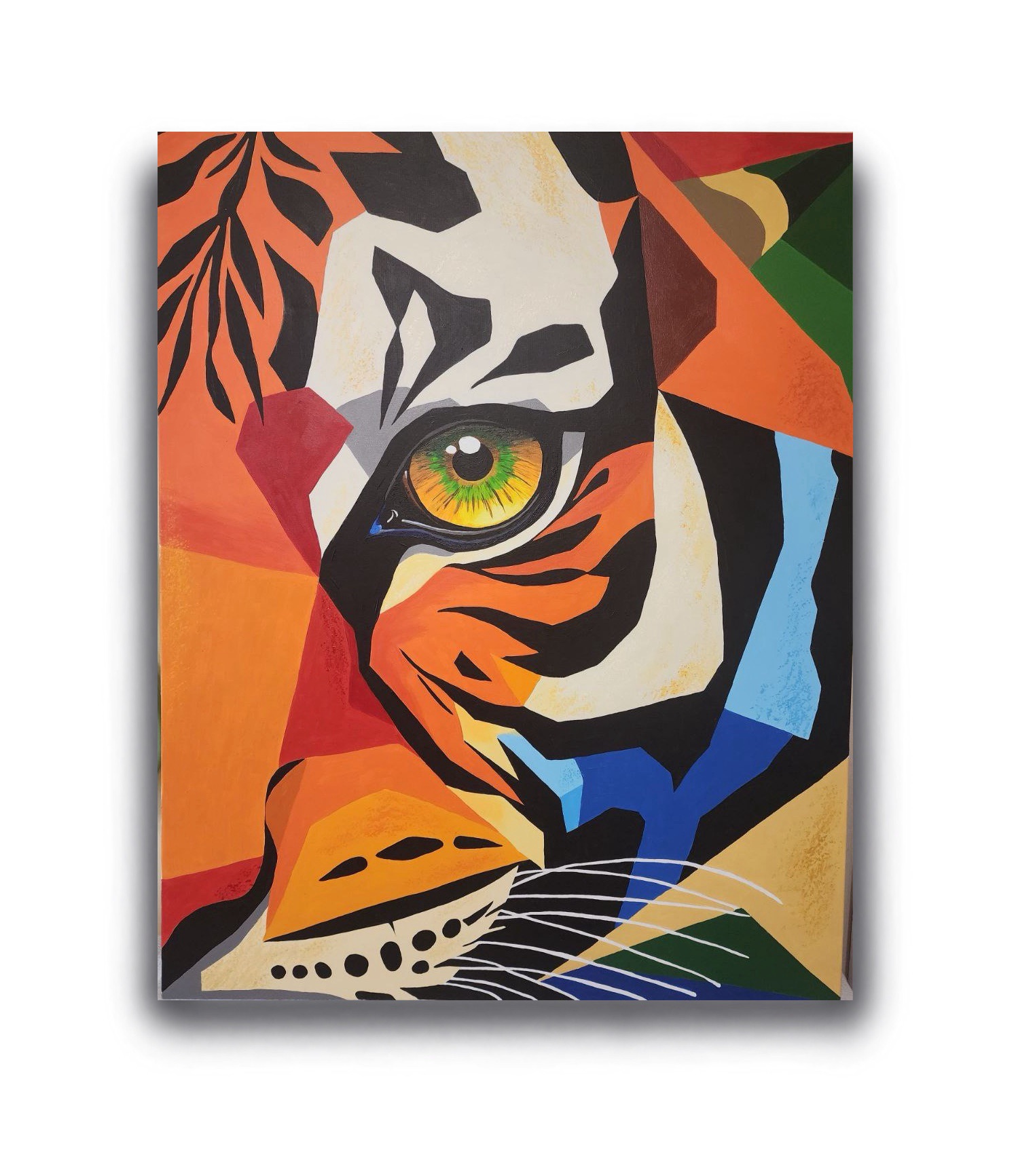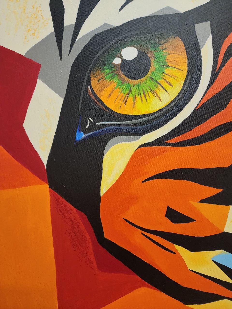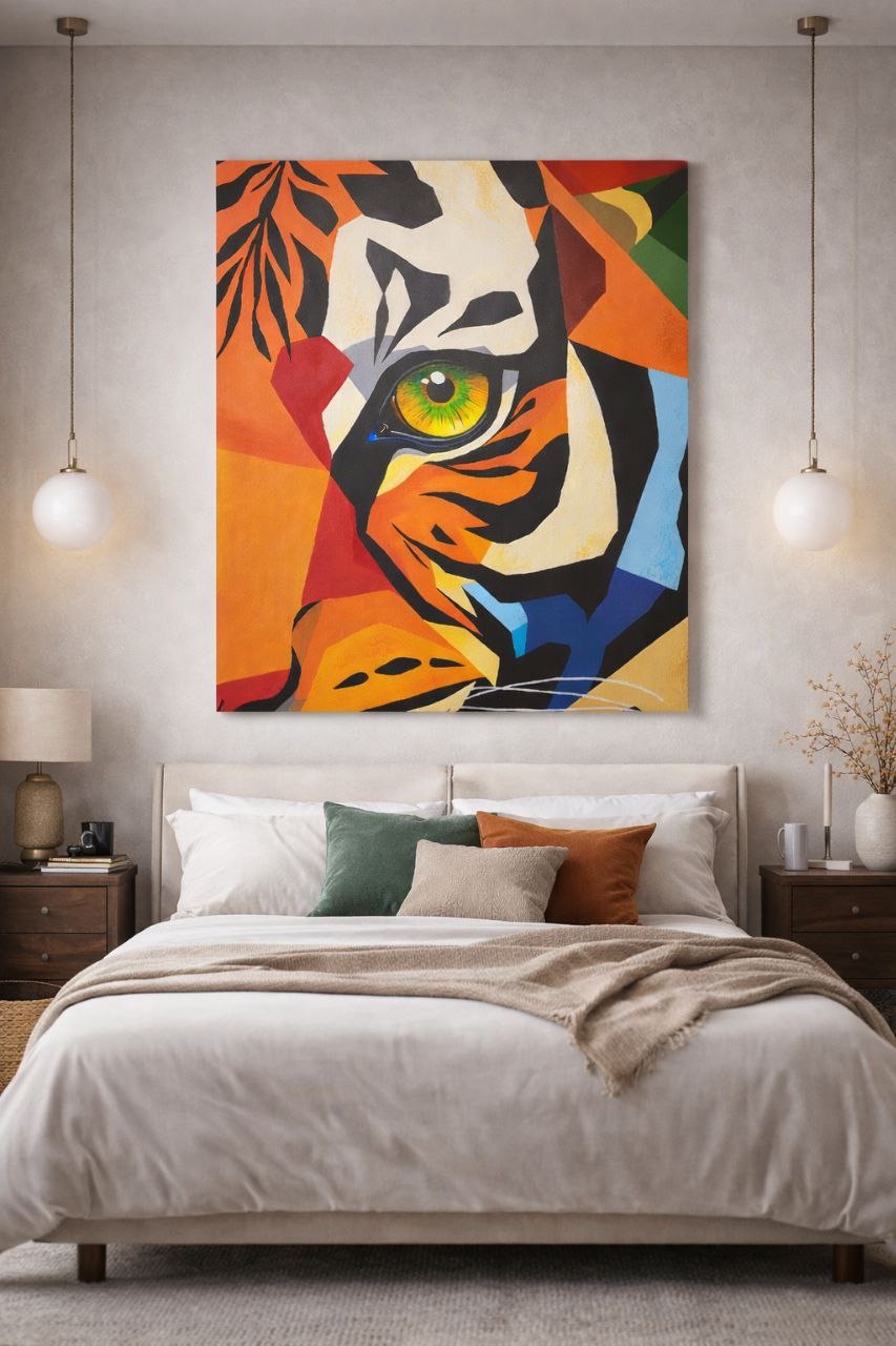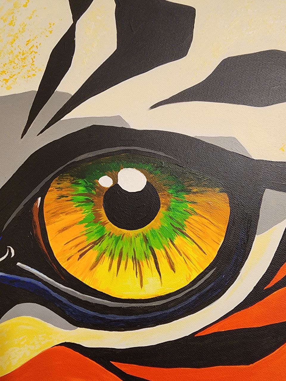 Глаз – центр композиции – живой, почти физически ощутимый. Он не угрожает, но и не отводит взгляд. Это спокойная сила внимательное присутствие, в котором соединяются инстинкт, мудрость и внутренняя тишина.